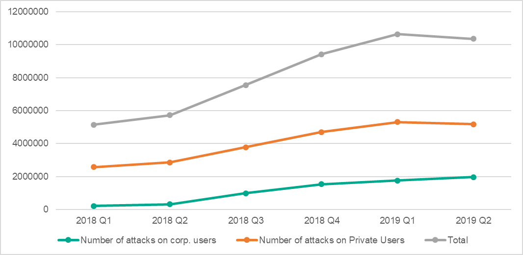 自从2018年上半年以来,卡巴斯基检测到的恶意文件(安装包)的数量一直在下降:2019年上半年下降了43%。与此同时,研究人员检测到攻击数量增长了107%。