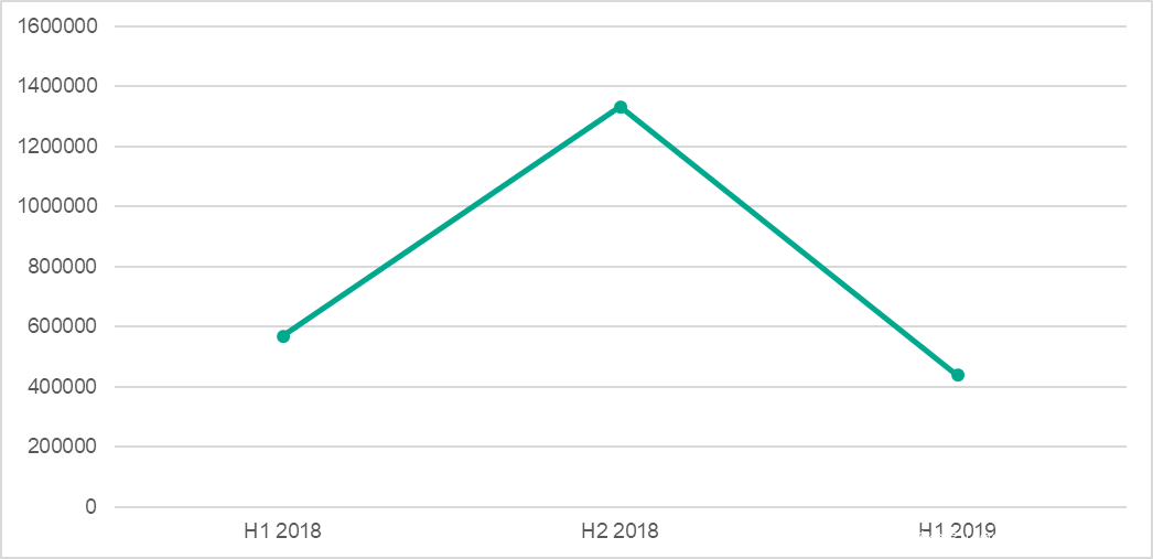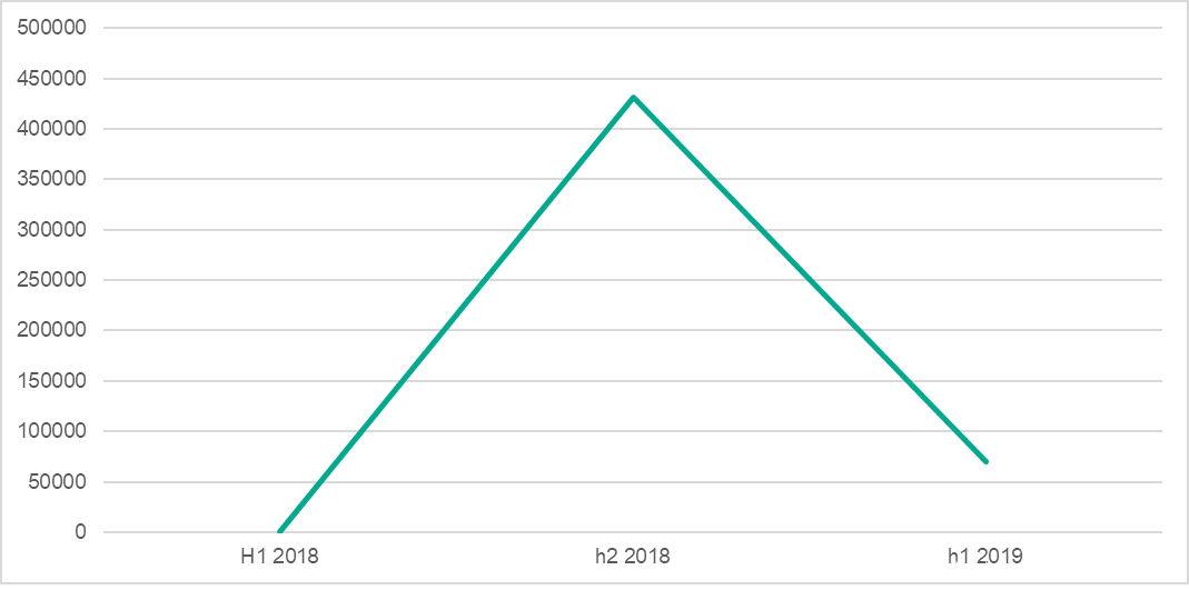 2018 H1 – 2019 H1,受银行木马Asacub攻击的用户数量