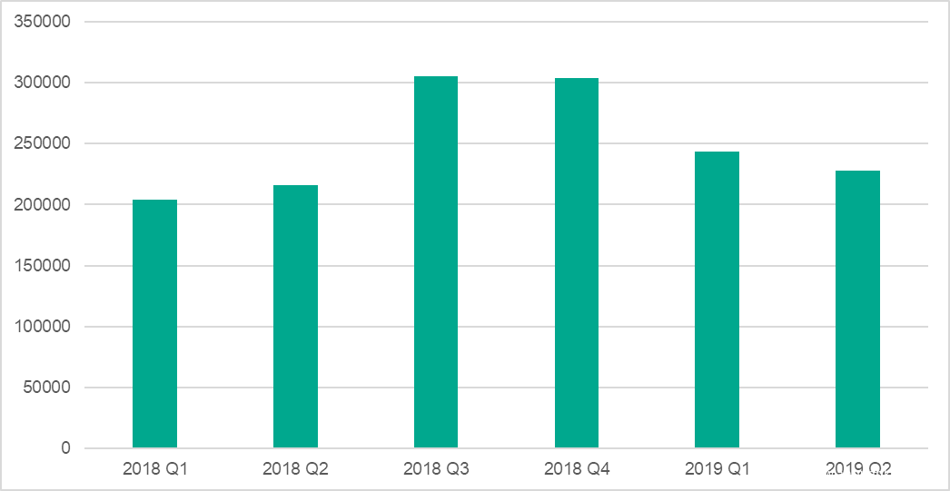 此外,研究人员还注意到了2019年恶意文件数量的增长。在第一季度,恶意样本的数量达到了335,000,是2018年同期的一倍还多,但到了第二季度,这一增长趋势变缓了。