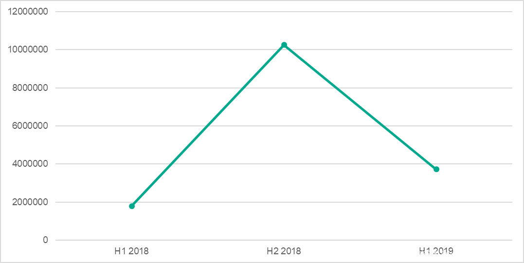 - 2019年上半年金融攻击的数量是10,493,792次 – 比2018年同期增长93%。