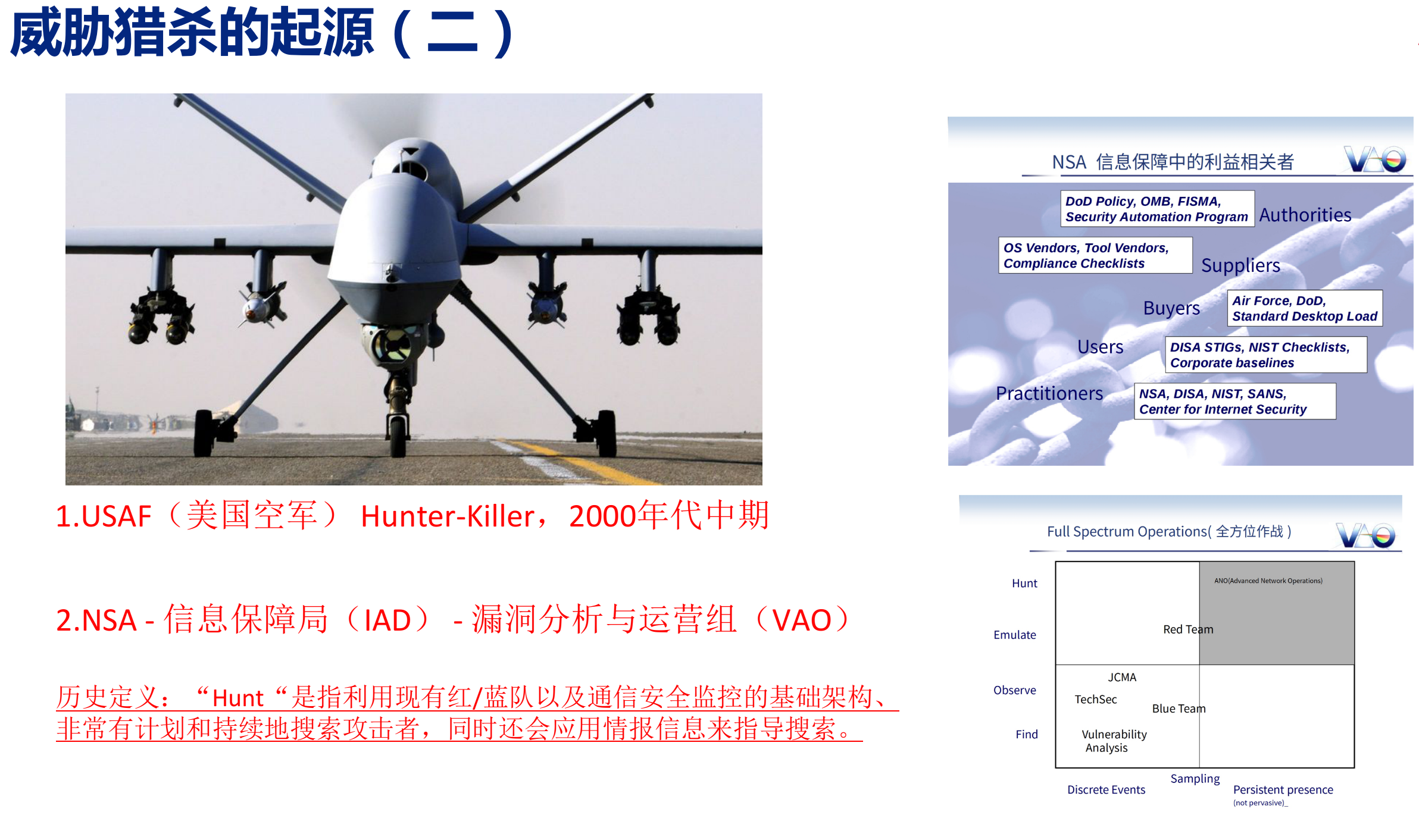 2) “Hunt”作为NSA信息保障署(Information Assurance Directorate)下VAO团队联合任务模式的一部分,在2000年代中期出现。它也是一种联合IA和 SIGINT(NSA创建时的两个主要任务,信息保障和信号情报)任务的一种方式即情报驱动Hunting。