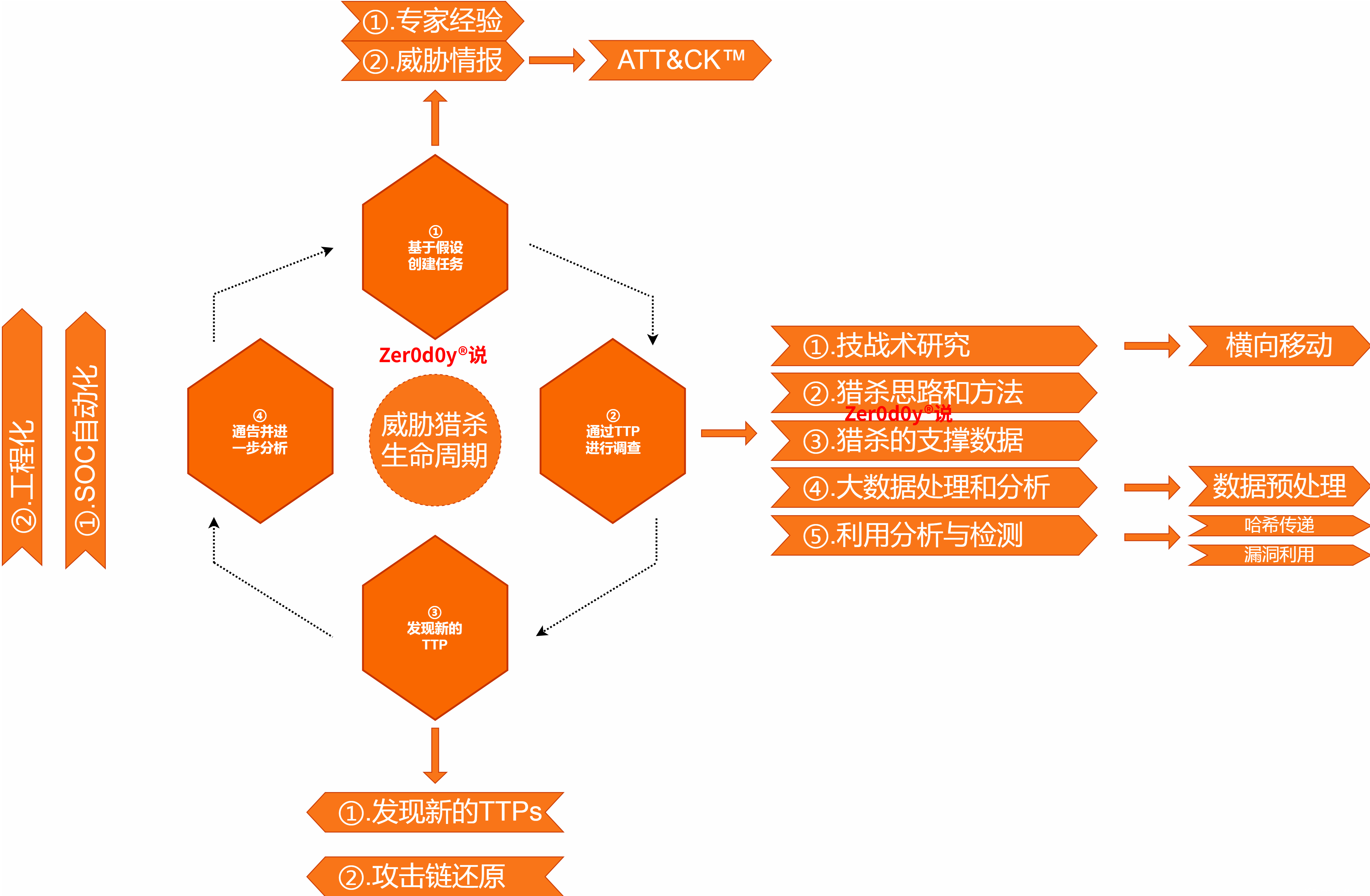 1) “Hunt“意味着利用现有红/蓝队以及通信安全监控的基础架构、非常有计划和持续地搜索攻击者,同时还会应用情报信息来指导搜索。