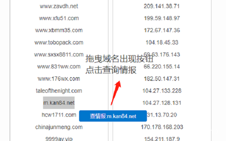 当分析师使用鼠标,用拖曳的方式选择网页中的IP或者Domain的时候,在鼠标旁边会出现一个写着“查情报:xxxx”的按钮,点击按钮,会自动打开第三方的IOC平台自动查询刚才选择的内容,无需人工选择IOC类型,程序会自动识别输入数据的类型并选择合适的查询方式,整个过程一键查询,非常方便。