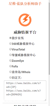 目前“蓝队助手”支持8个平台的一键查询,包括4个威胁情报平台(微步在线、360威胁情报中心、VirusTotal、绿盟威胁情报中心),2个网络空间搜索引擎(ZoomEye、FOFA),以及2个基础信息查询平台(查询旁站和Whois信息)。选择相应的平台,即可进行一键查询。