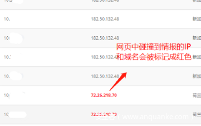 使用时,“蓝队助手”会遍历网页中的每一段文本,使用正则提取其中的IP/Domain,与本地情报进行碰撞,碰撞成功后标红加粗显示。如图。