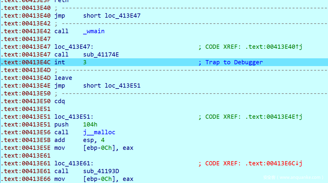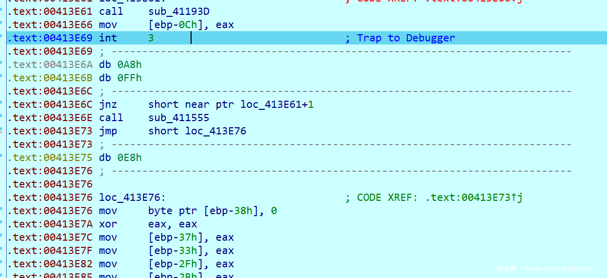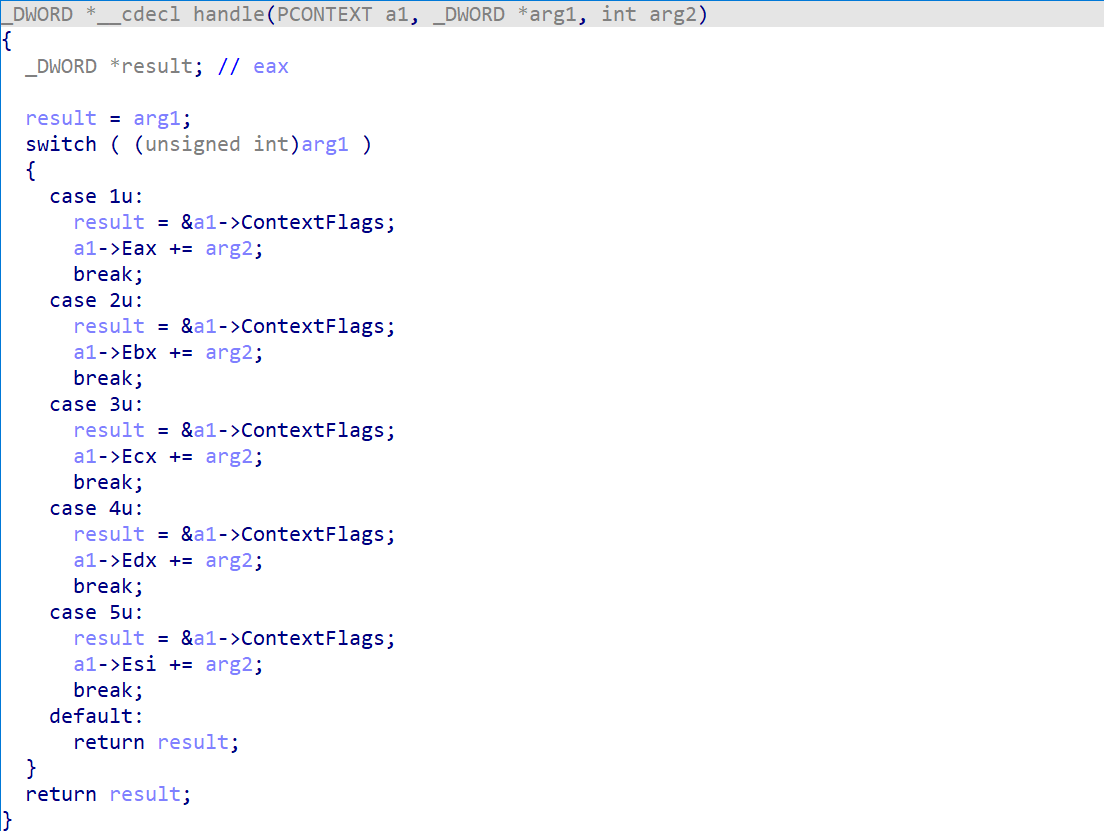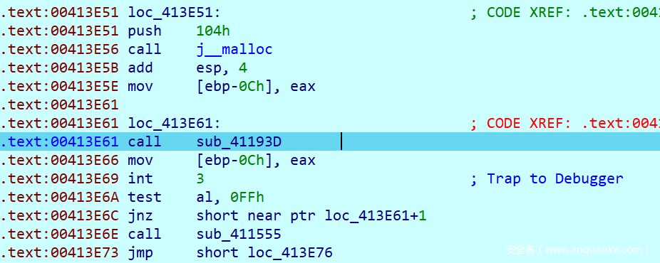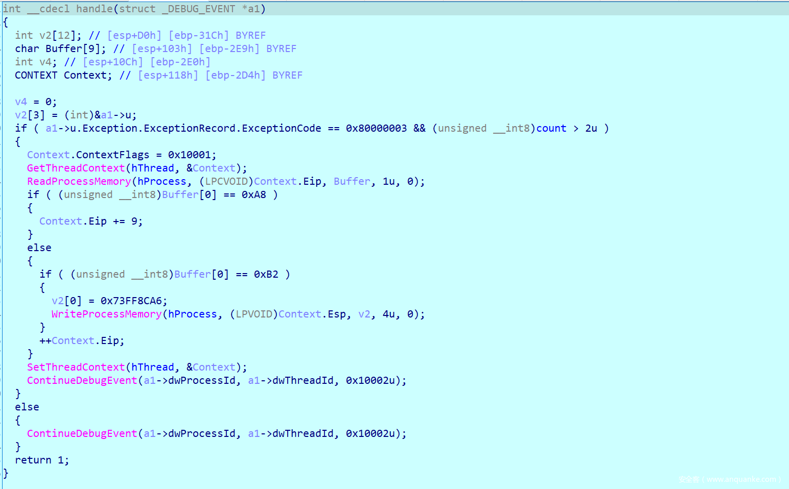 这里就是另一个坑点了,可以发现这个函数中存在一个int3断点,而其对应的内容是0xB2,按照之前所说的调试处理的逻辑,我们要替换ESP中的内容,并且让EIP + 1,查看汇编不难发现,他替换的内容就正好是传入push的一个值8E32CDAAh并且把他替换成0x73FF8CA6,这里我刚开始因为没有注意,死活解不出来。