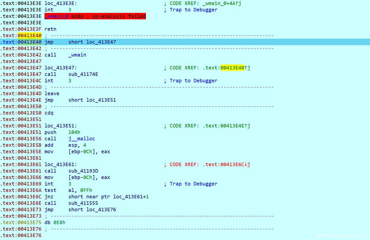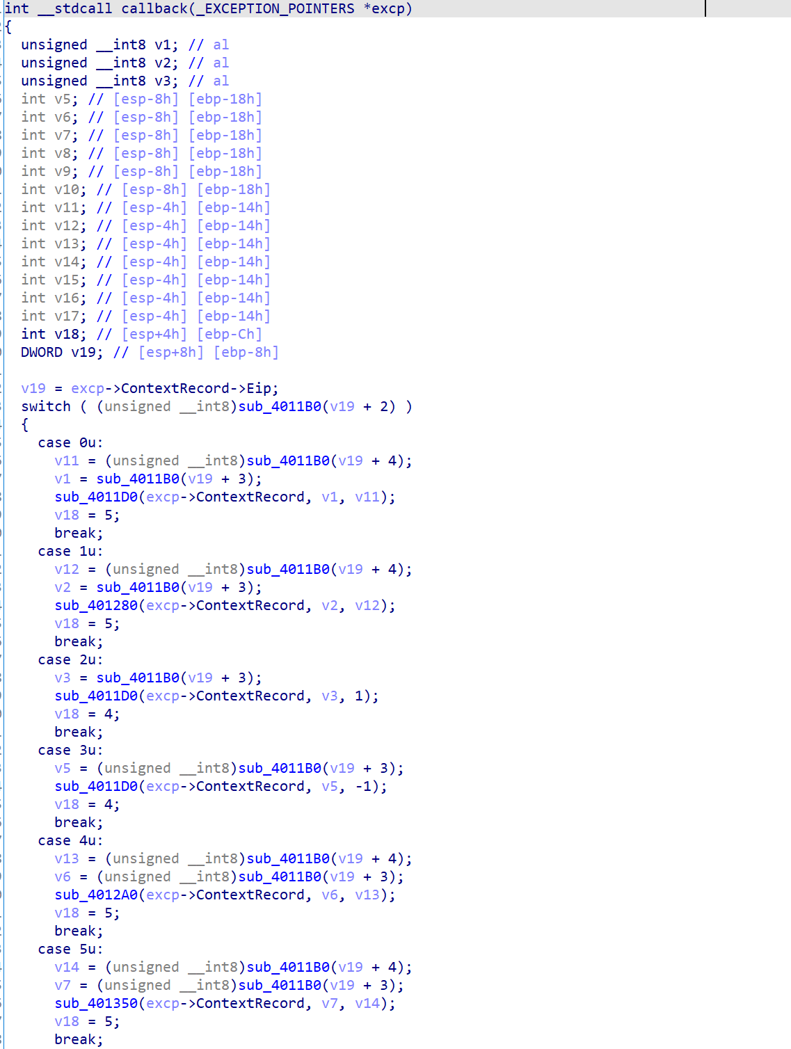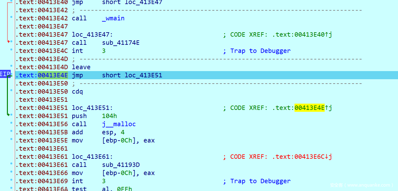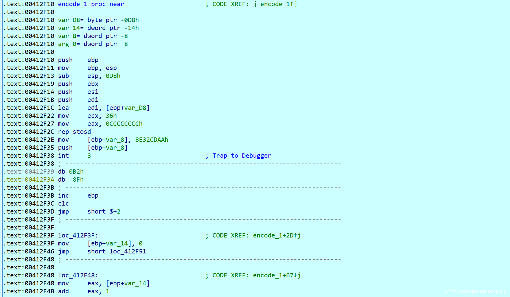 这里就是另一个坑点了,可以发现这个函数中存在一个int3断点,而其对应的内容是0xB2,按照之前所说的调试处理的逻辑,我们要替换ESP中的内容,并且让EIP + 1,查看汇编不难发现,他替换的内容就正好是传入push的一个值8E32CDAAh并且把他替换成0x73FF8CA6,这里我刚开始因为没有注意,死活解不出来。