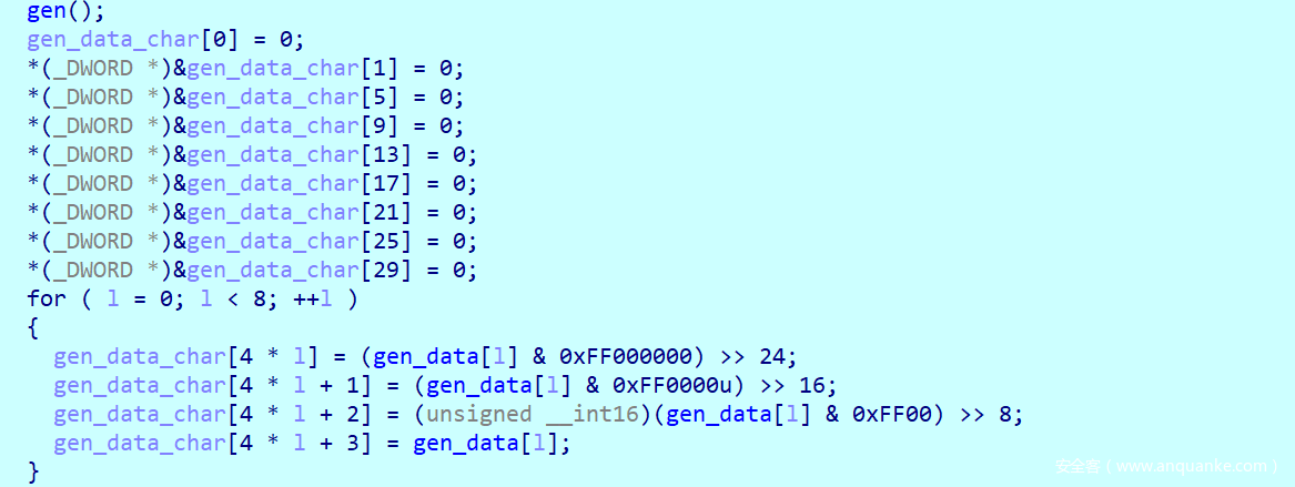 通过gen函数生成一些int的内容,具体啥过程并不重要,因为这些字符的内容都是固定的,并且把结果都放在gen_data中,然后又放到gen_data_char中
