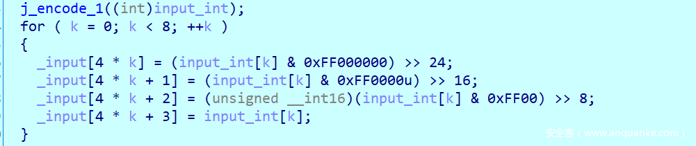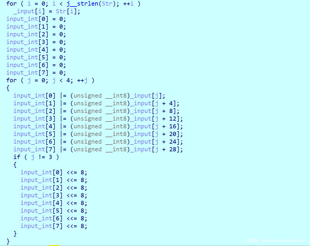 把Str的信息都赋值给input,其中Str就是我们输入的flag信息,然后通过循环把input的内容都转换为int数据储存给input_Int,大家可以眼熟一下这个模块,所干的事情就是把字符四字节的储存。