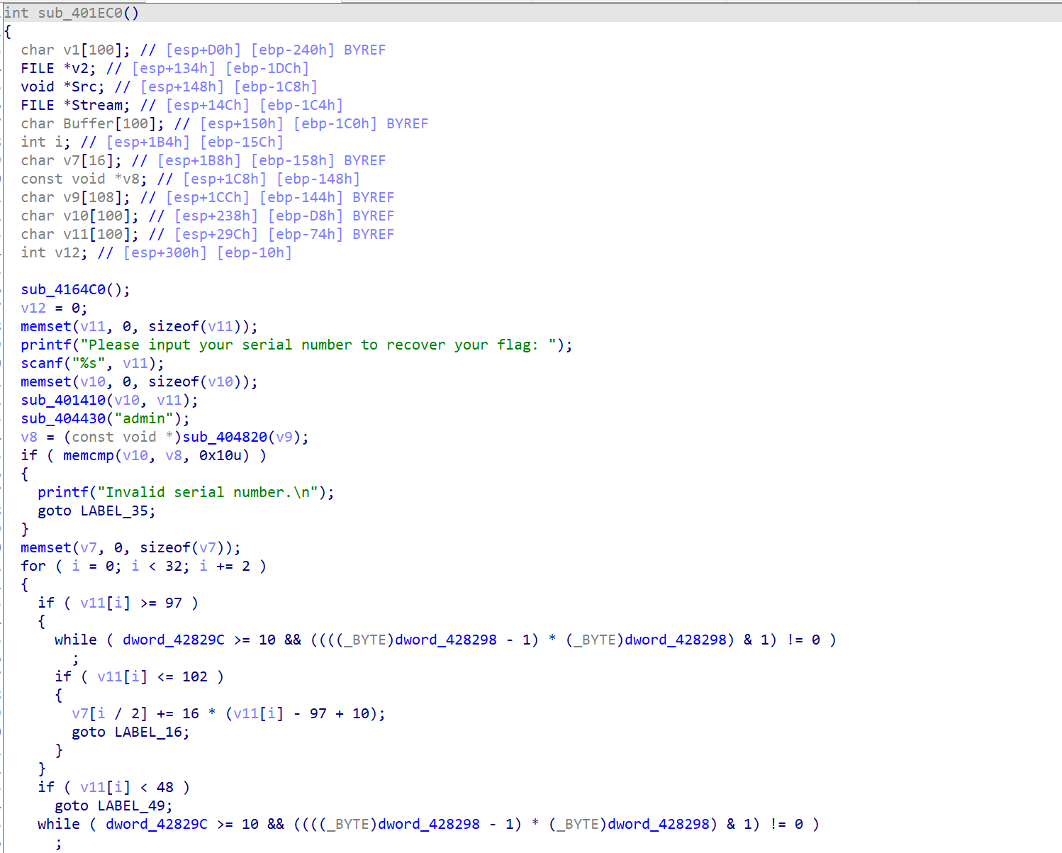 虽然不知道他的那个while是在干什么,但是通过动态调试可以发现,这一段其实就在把你输入的16进制字符串转换为内部储存的字节形式。