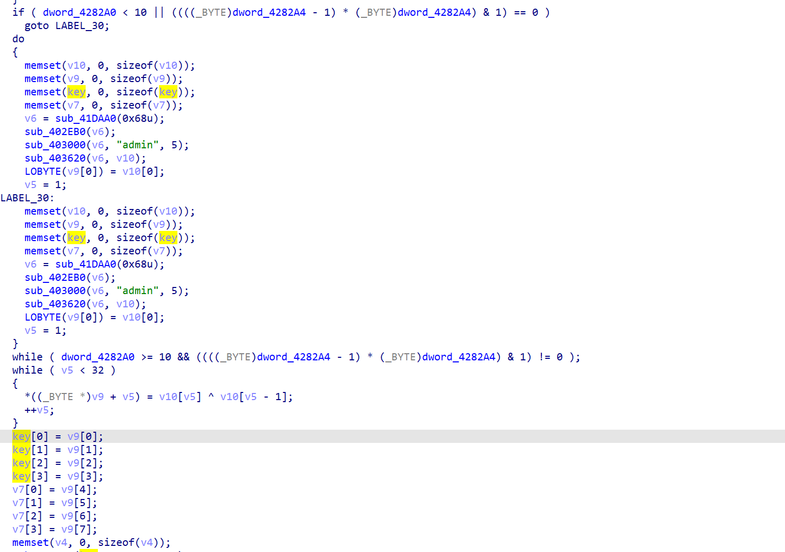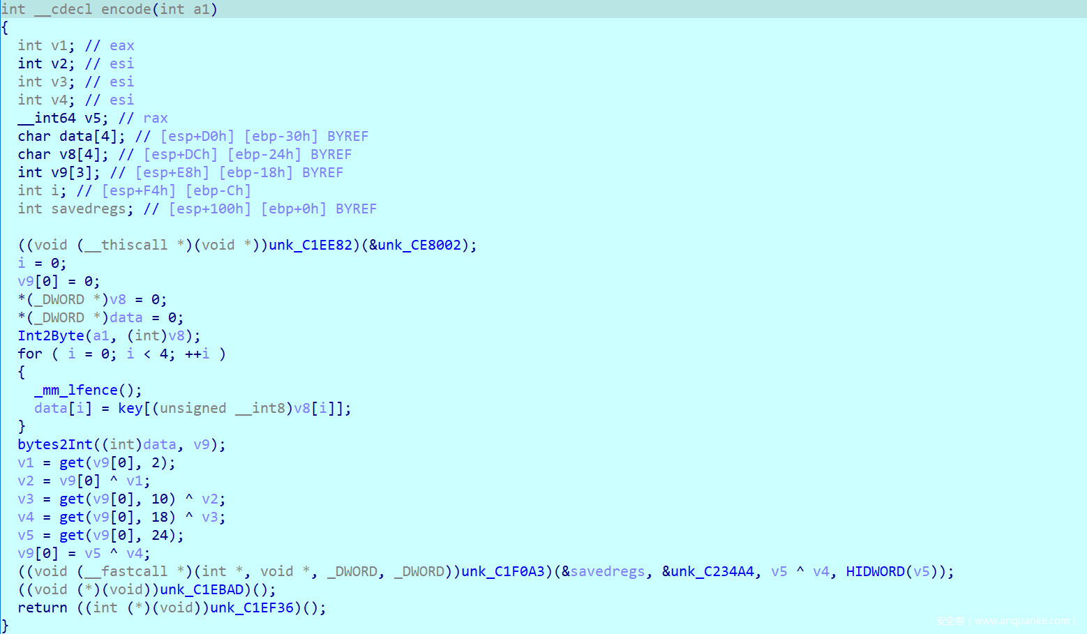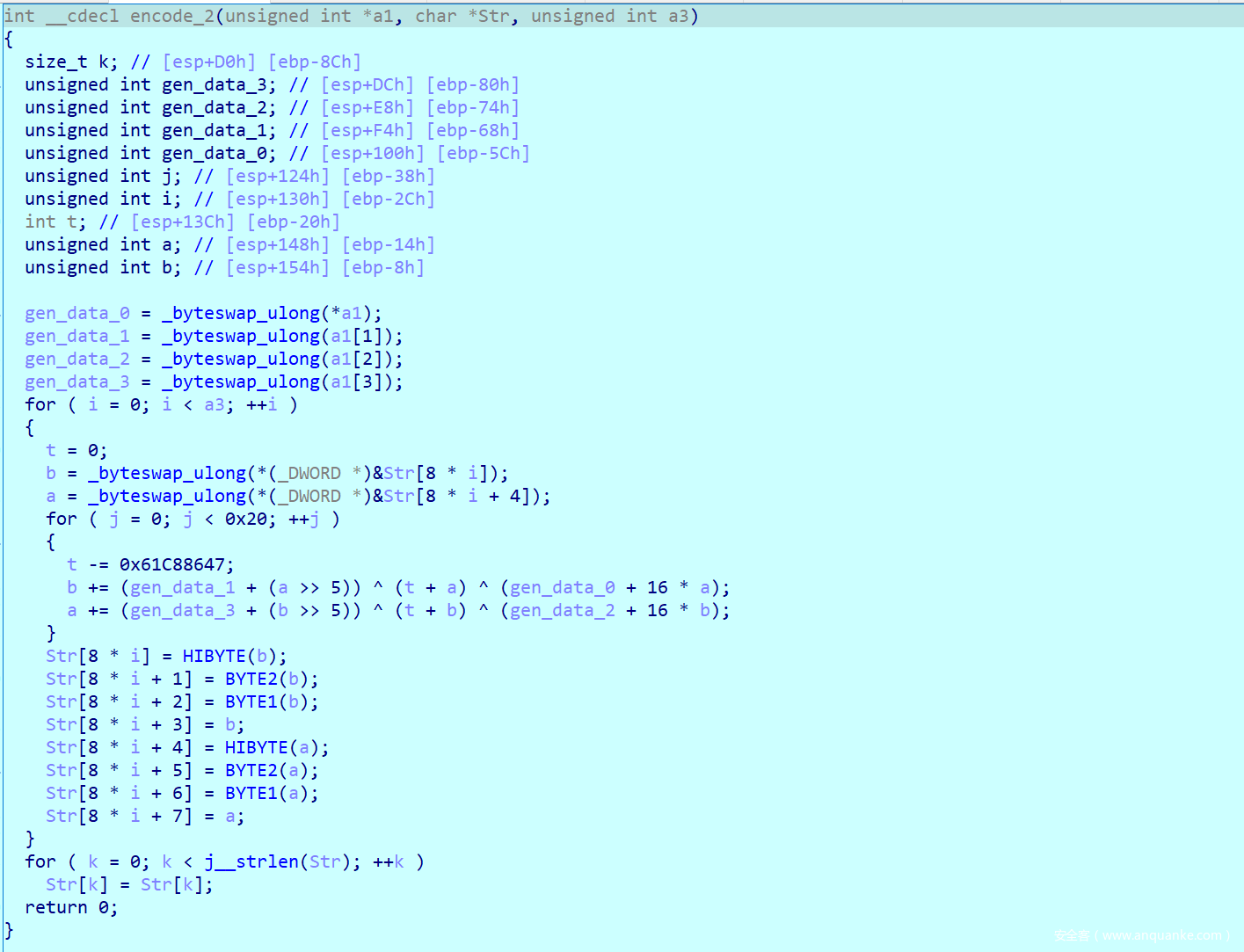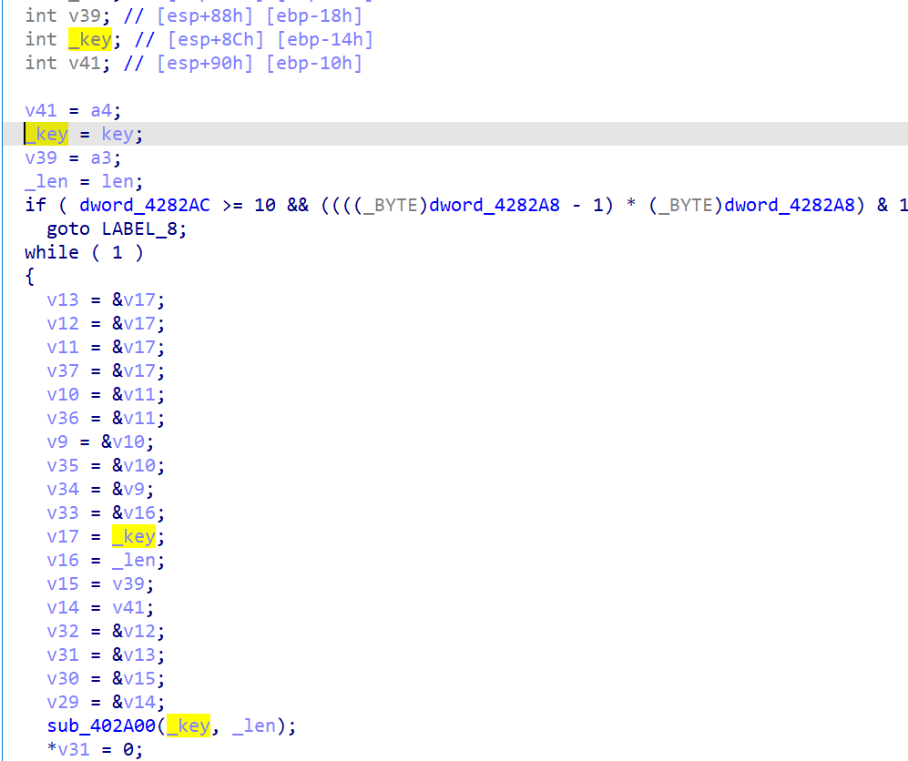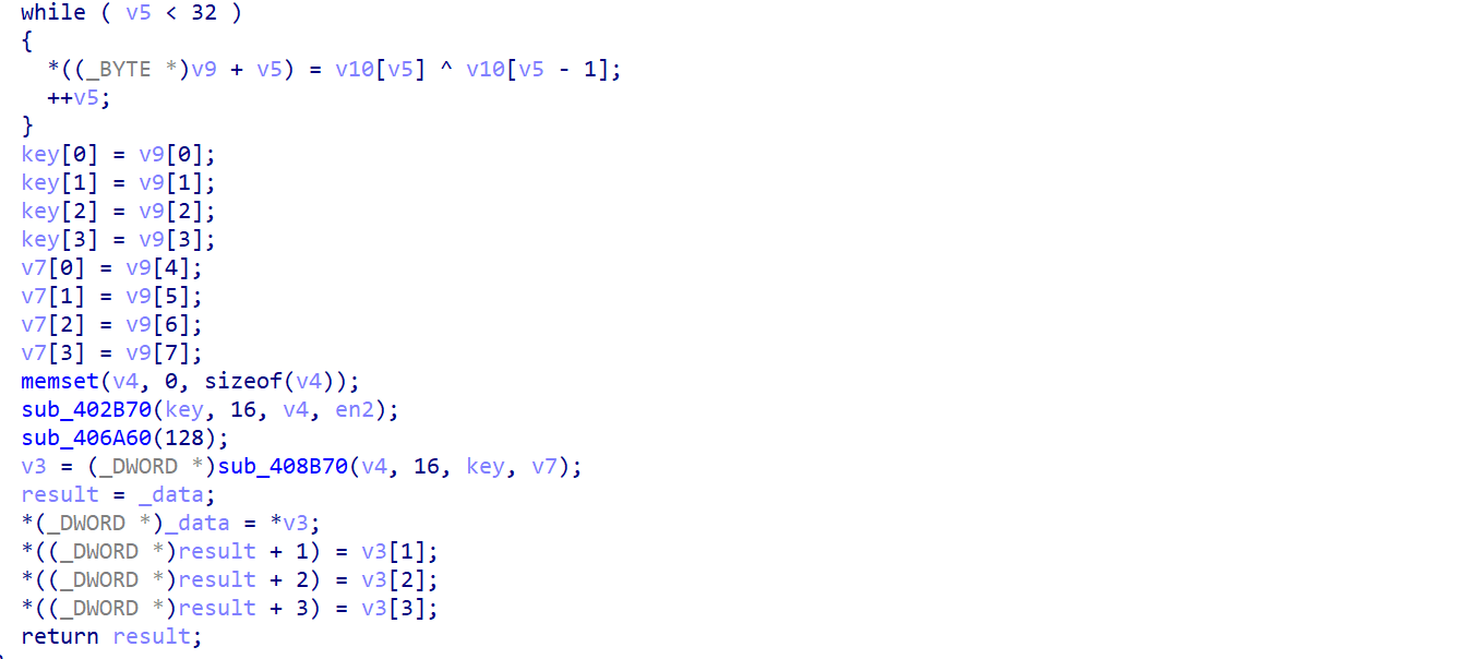 可以发现最后生成的key是固定的,我们所需要分析的就是sub_402B70函数了,他传入了en2,也就是我们之前加密的内容,并且传入了key(名字是我分析之后修改的)