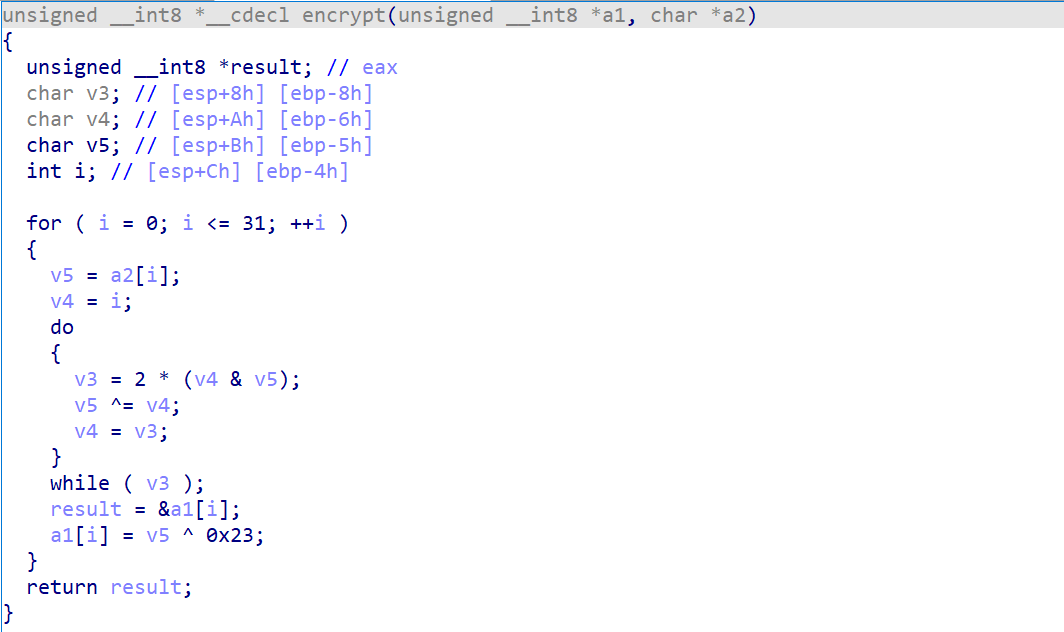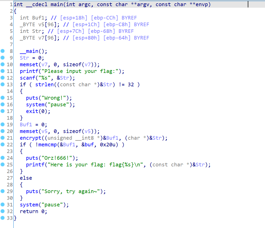 其中第一个限制就是要求输入的字符长度为32位,否则就会直接退出,然后通过一个加密函数把输入的内容加密,加密之后通过memcmp进行比对,这也是一种非常常见的RE模型,也就是让你还原encrypt的过程
