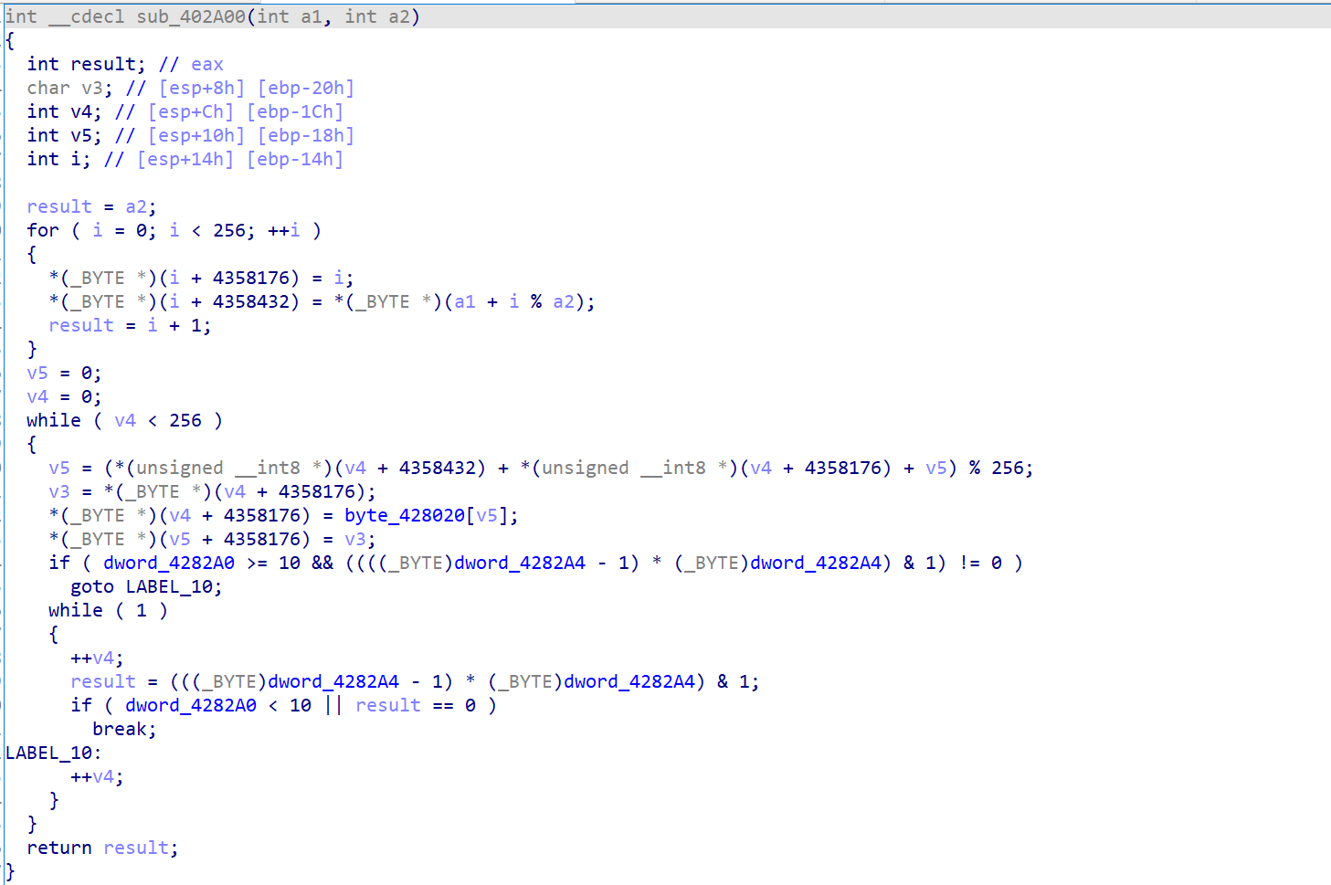 而这里的循环的次数和循环内所干的事情都符合,并且我们可以发现他对传入的key的信息进行处理,所以我们就可以大胆的猜测这里是rc4