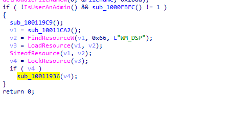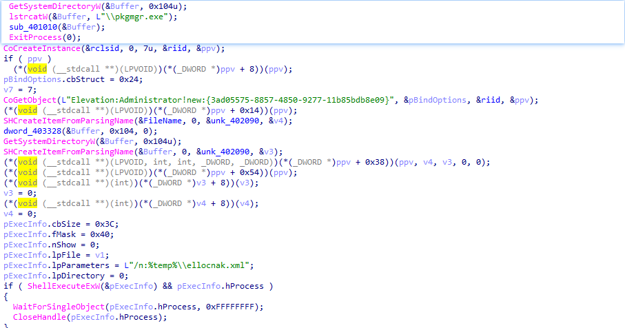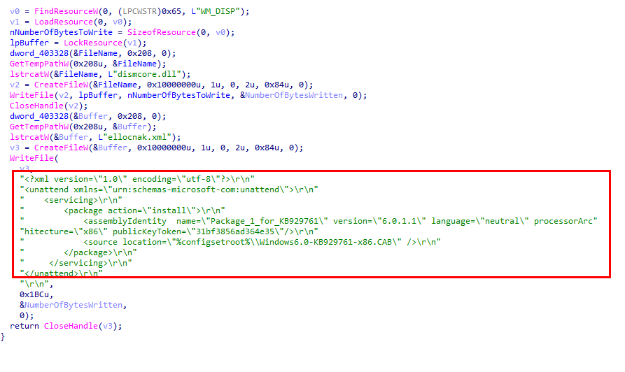 该资源文件成功加载后,尝试从其资源“”WM_DISP”获取数据,释放”dismcore.dll”,”ellocnak.xml”到”%TEMP%”目录下,调用COM组件IFileOperation,从而实现绕过UAC,复制文件dismcore.dll到系统路径。