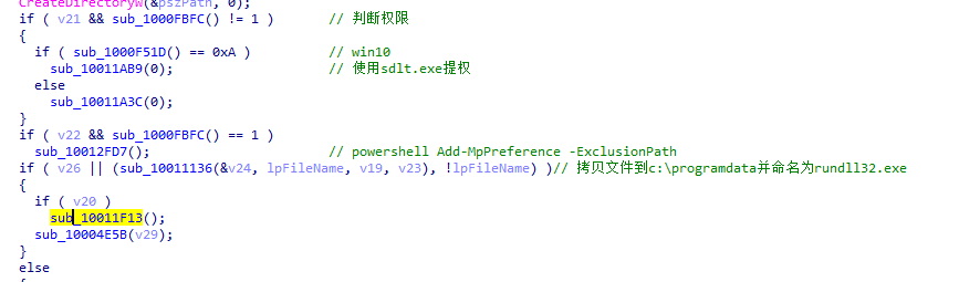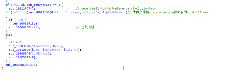 若权限属于高权限后,样本则进入部署流程。则执行powershell命令添加排除项,以躲避windowsdefender的查杀,拷贝自身到c:\programdata并命名为rundll32.exe,设置持久化。