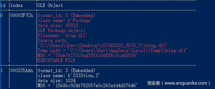 确定该样本是RTF格式文档后,可以使用oletools工具中的rtfobj对其进行分析,oletools可直接通过pip install -U oletools直接安装,使用rtfobj.exe解析该样本结果如下: