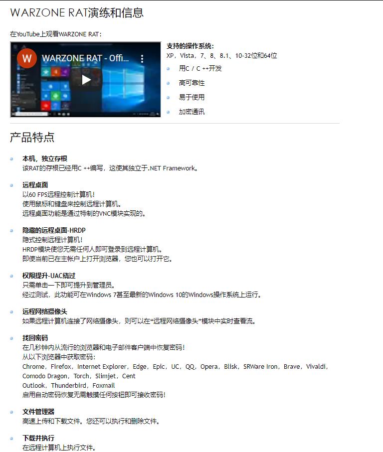 对warzone搜索发现,发现该样本是WARZONE RAT,其官方介绍如下,拥有多种功能 。