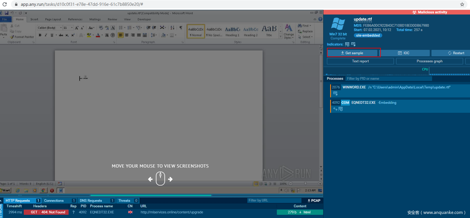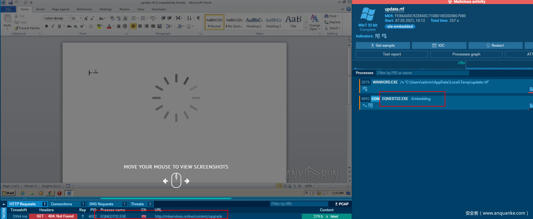 可见样本中存在两个OLE,其中有一个dll,且路径疑似为C:\Users\Dev\Desktop\07082020_8570_S\bing.dll。猜测其为攻击者的路径,而通过anyrun沙箱进程,可发现该样本会启动公式编辑器进行网络链接,所以猜测是公式编辑器漏洞利用样本。
