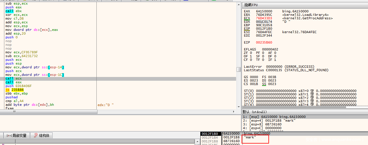 此处利用IDA分析bing.dll,直接分析其导出函数mark.该函数较长,直接并未看出什么问题,还是老实的进行单步跟踪。调试 发现,函数刚开始通过解密操作,在内存解出一个lnk路径以及一个URL: