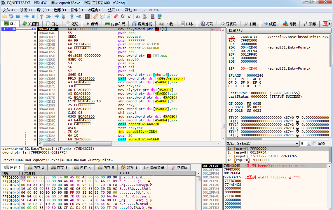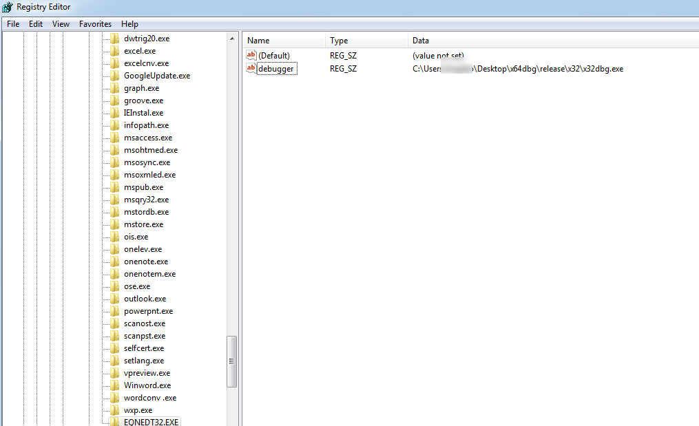 我对漏洞不太了解,不太会分析,但可以学习网上关于公式编辑器漏洞的的分析,尝试去分析。首先设置注册表项HKEY_LOCAL_MACHINE\SOFTWARE\Microsoft\Windows NT\CurrentVersion\Image File Execution Options\EQNEDT32.EXE,添加debugger设置为调试器,当样本利用漏洞成功即会启动EQNEDT32.EXE,从而利用调试器附加。
