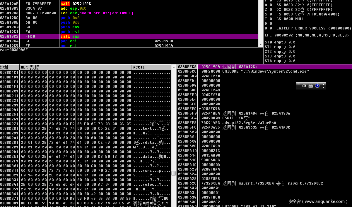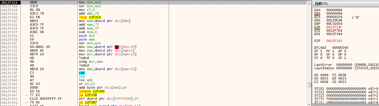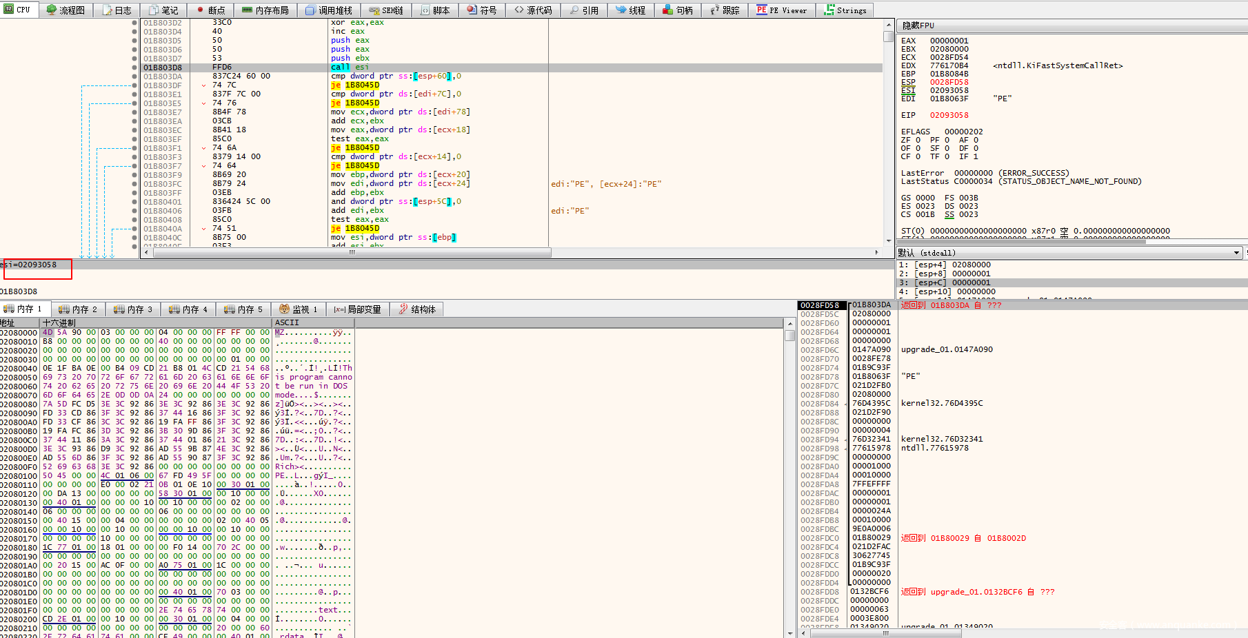 调试发现前面的shellcode将对重新开辟一段内存空间,将PE文件拷入新开辟的空间中,之后进行调用。
