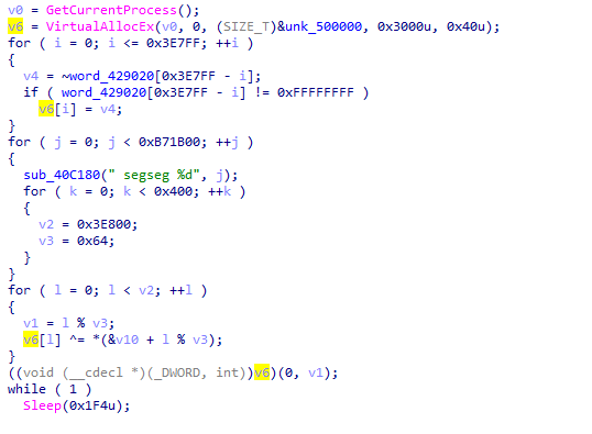 发现并未加壳,直接IDA打开分析。该样本会在执行后先开辟一段内存空间,然后利用异或的方式直接解密出一段数据,然后调用该内存。