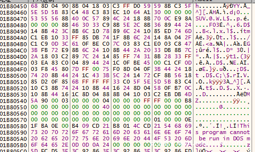 只能再次拿出X64DBG对其进行分析调试,查看解出的数据是什么格式。调试发现,解出数据包含一段pe文件。猜测前面的乱码数据是为了加载后面的pe文件。
