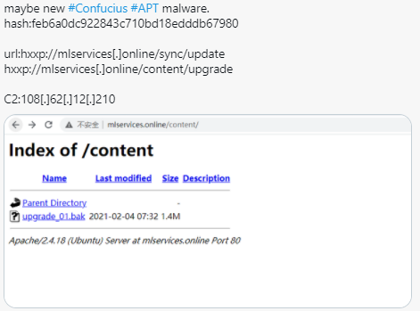 最近准备找工作,准备学习一手APT组织相关的样本,最近在某社交网站上发现大佬发的Confucius样本。