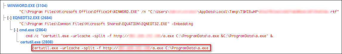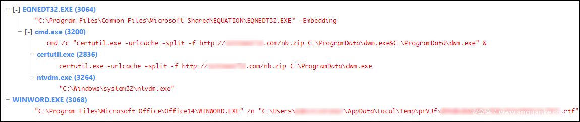 这种方法在这篇文章中有描述(https://evi1cg.me/archives/remote_exec.html ),由上面的分析可以看到,在用CVE-2018-0798 相关样本中用到了这种技巧。同一天我们还抓到另一个利用CVE-2018-0798进行攻击的样本也利用了certutil.exe,第二个样本的进程树如下: