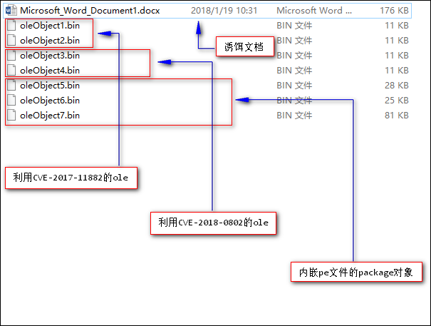 该样本为docx格式,组织相对简单,在\word\embeddings下含两个ole对象:一个利用CVE-2017-11882,一个利用CVE-2018-0802。