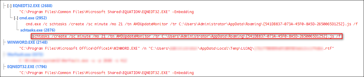 首先,这个样本也在Word插件目录下放置了一个a.wll文件,不过引起我们注意的是它进程链里面创建的计划任务: