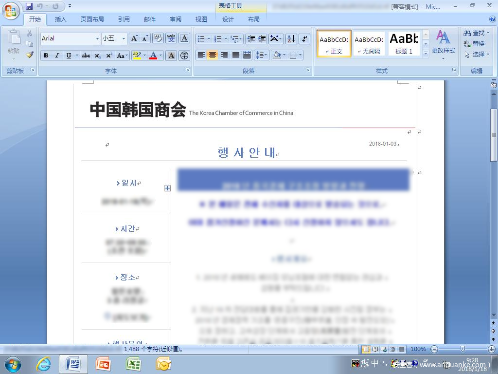 2018年1月18日,我们捕获了2个文档诱饵内容包含中国韩国商会的攻击样本,这两个样本分别独立利用CVE-2017-11882和CVE-2018-0802,内容完全一致: