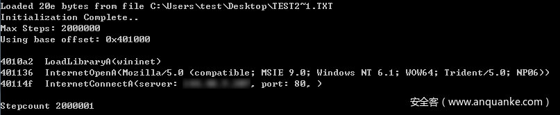 可以看到里面还有第3层base64加密,解密后的数据会被直接加载进内存,然后将内存起始地址直接传给新创建的一个线程,我们将上图中的base64进行解码,保存成二进制文件后用模拟器执行,得到如下结果: