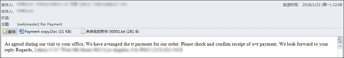 第一个样本为2018年1月3日捕获,邮件信息如下: