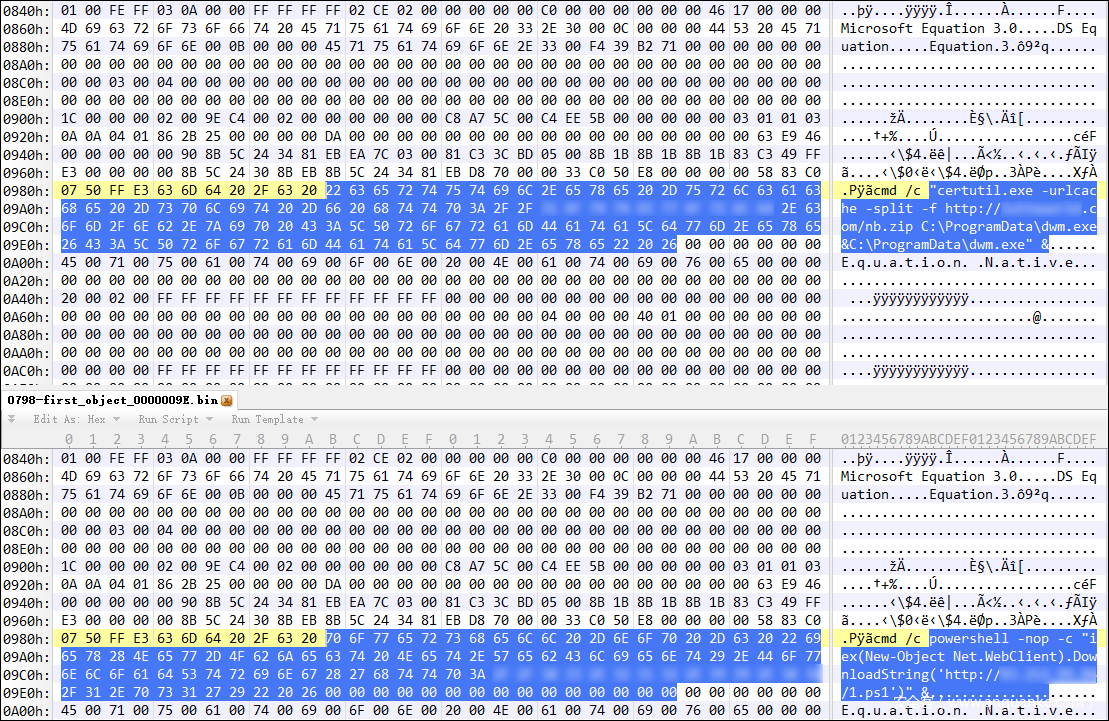 从下图的对比可以看到,攻击样本和测试样本除了命令行参数不同外,其余字节完全相同,明显是同一团伙所为(上半部分为1月19日的攻击样本,下半部分为1月16日的测试样本):