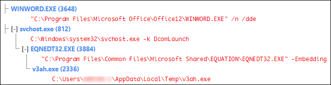该漏洞触发后的payload部分比较简单,只是简单启动一个叫做v3ah.exe的进程,因此shellcode部分无需详细展示。本文不对payload部分作详细讨论。该样本在我们的平台跑出的进程链如下: