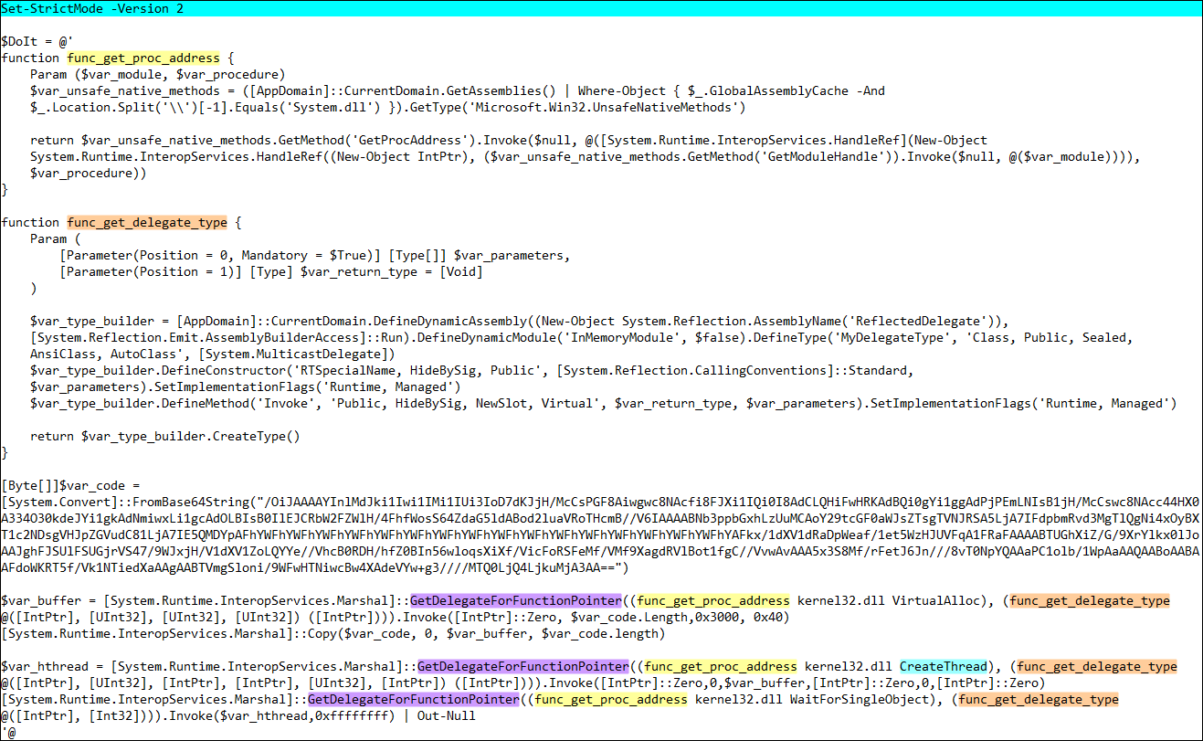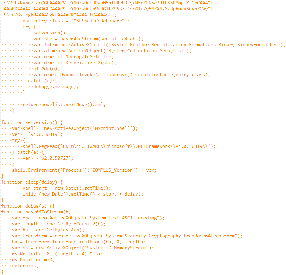 如果文件名正确指定,则1.xsl中的base64加密部分会被解码后以二进制形式直接加载进内存,可以看到解码后里面含有一个PE文件,通过阅读上述xsl代码,可以看到最终会启动MSFShellCodeLoader2函数,函数名已经清楚地解释了它的作用。整个过程文件不会落地。