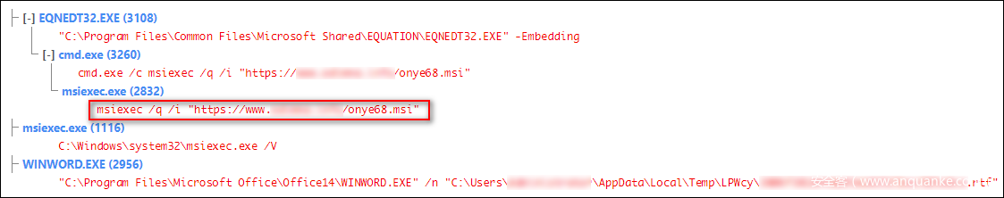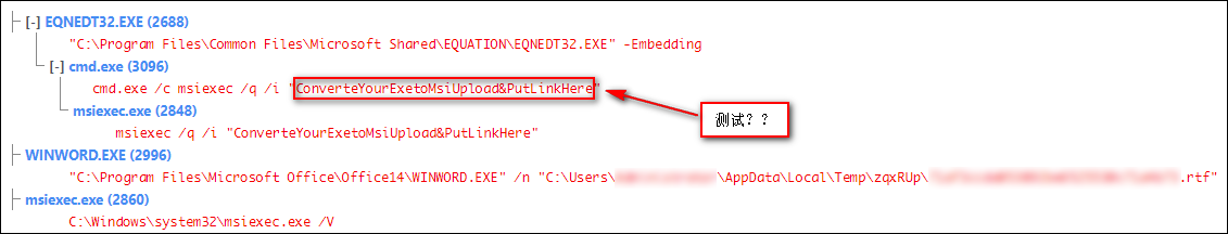 不过,我们在2018年1月24日又捕获两个利用msiexec.exe的CVE-2017-11882样本,两个样本的诱饵内容都只有寥寥几句话,一个写的是订单事宜,一个写的是银行事宜。这次终于不是测试了,两个样本跑出的行为完全相同,如下,可以看到之前原来测试语句的地方现在已经被远程msi文件所替换。