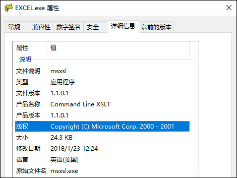 所谓的EXCEL.exe其实是微软的msxsl.exe文件,该文件的数字签名已过时。用msxsl.exe配合xml去启动xsl文件的套路并不新颖,网上已有相关分析文章(https://evi1cg.me/archives/AppLocker_Bypass_MSXSL.html ),此处不过多展开。