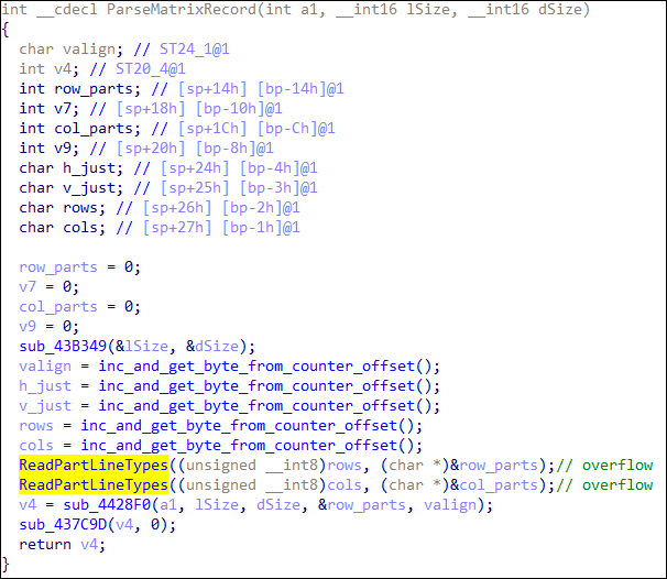 相关调用点位于ParseMatrixRecord(sub_443E34)函数内,其中发生溢出的是高亮的ReadPartLineTypes(sub_443f6c)函数