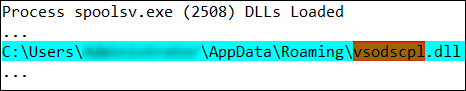 可以看到spoolsv.exe程序被启动,在它的dll加载列表中,就有恶意的vsodscpl.dll: