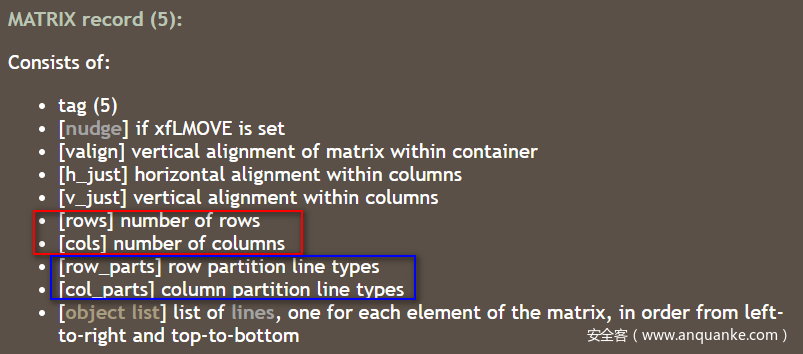 CVE-2018-0798的根本原因是office公式编辑器在解析Matrix Record(0x05)的内容时,解析到rows与cols成员时没有进行额外的长度校验,通过构造恶意数据,可以任意指定后面读入的row_parts和col_parts长度,从而导致栈溢出(如下图所示):