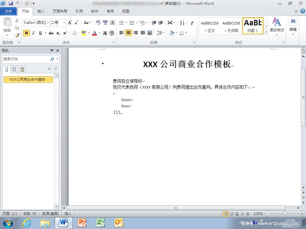 我们在2018年1月17日捕获一个以商业合作模板为诱饵的中文样本,该样本只利用了CVE-2017-11882漏洞,打开后界面如下: