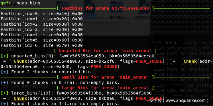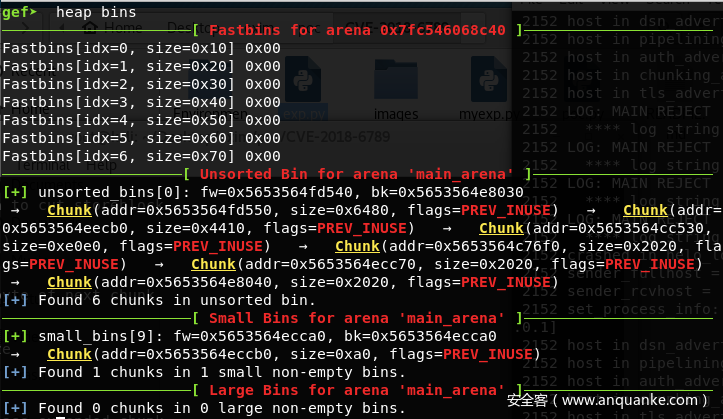 ehlo 0x2c00字节,回收unrecongnized command分配的内存,空出0x2020个字节。在docker环境的调试中,有研究人员提到,由于之前的ehlo(s, "a"*0x20)占用的0x30字节的内存释放,会空出0x30+0x2020=0x2050字节空间内存,但我的真实环境却不是这样。