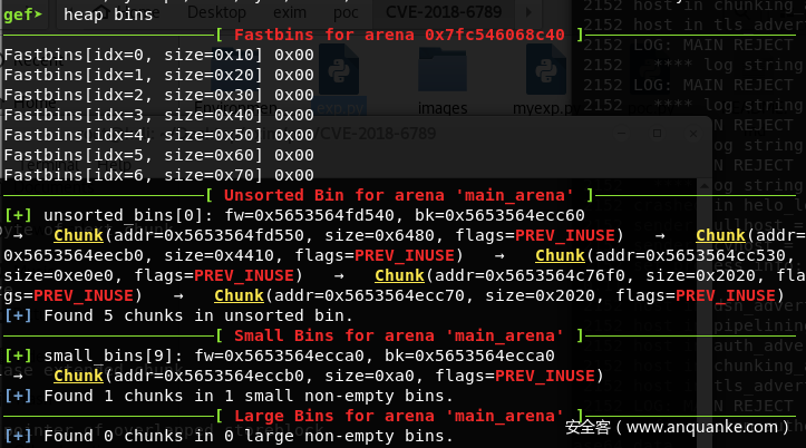 该漏洞利用条件是比较苛刻的,exim的配置必须开启CRAM-MD5认证,其次exim的启动参数不同会造成堆布局不同,还有必须获取exim运行时堆的地址,才能准确覆盖acl字符串,docker环境中可以选择爆破,但真实环境中在不知道exim程序基地址的情况下采用爆破显然不大可取。如果大家有什么好的思路可以获取exim的堆地址,可以交流一下。