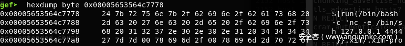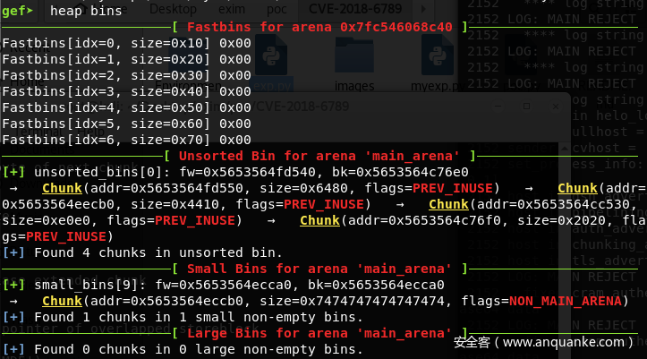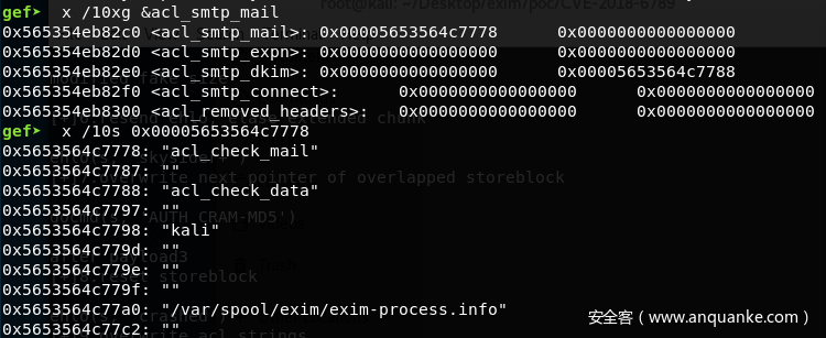 exim有一组全局指针指向ACL字符串。指针在exim启动时初始化,根据配置文件进行设置。配置文件中包含acl_smtp_mail=acl_check_mail,因此指针acl_smtp_mail始终指向acl_check_mail,只要碰到MAIL FROM,exim就会执行acl检查。因此只要覆盖acl字符串为${run{command}},exim便会调用execv执行command命令,实现远程命令执行,而且还能绕过PIE、NX等限制。通过x /18xg &acl_smtp_mail可以得到acl_check_mail字符串的地址,从而可以找到acl_check_mail所在chunk的地址(本例中为0x5653564c7778),我经过调试和计算,acl_check_mail字符串所在堆的地址也可以通过堆基地址加上0x66f0的偏移得到。